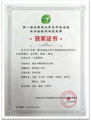 2021级研究生卢锋负责,许云美、万丽婷、赵湖云、胡欣月、周皓文、马倩参与的作品《通风井巷断面优化系统》,在刘杰老师、杨溢老师、王孝东老师的悉心指导下荣获二等奖,同时荣获昆明理工大学大学生节能减排社会实践与科技竞赛选拔赛一等奖。