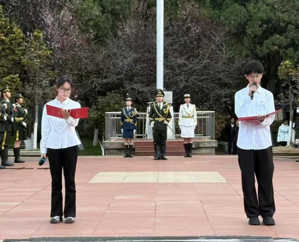 在五星红旗的映衬下,学生代表进行了题为《传承雷锋精神,点亮青春之光》的演讲,他们号召同学们:驿路梨花处处开,雷锋精神代代传。让我们行动起来,用满腔热忱共唱一首雷锋赞歌,用朝气蓬勃奉献青春力量!