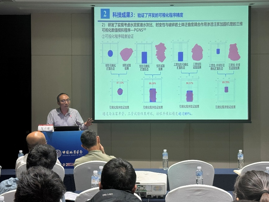 杨志全教授会上作了题为“破碎岩土体注浆加固关键技术与应用”的专题报告。该报告围绕国家战略需求及科学理论难题与工程技术瓶颈系统地展示了团队在宾汉水泥浆液时水效应、松散破碎岩土体迂曲效应和基于渗透注浆机理的可视化及工程应用案例等方面的最新研究成果。