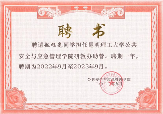 赵旭光同学不仅在专业知识上取得了优异的成绩,还积极参与各种学术活动,拓展了自己的学术视野和知识面。他严格要求自己并刻苦钻研,获得了一系列的奖学金,包括国家奖学金、昆明理工大学学业一等奖学金等。同时,他也积极参加各种相关学术比赛,获得昆明理工大学第三届综述大赛校级二等奖、昆明理工大学“安全在心·责任在肩”实验室安全微视频创作及宣传海报设计大赛宣传海报设计类校级三等奖和2022年第一届“应急科普天下行”防灾减灾专题知识竞赛校级一等奖等奖项。